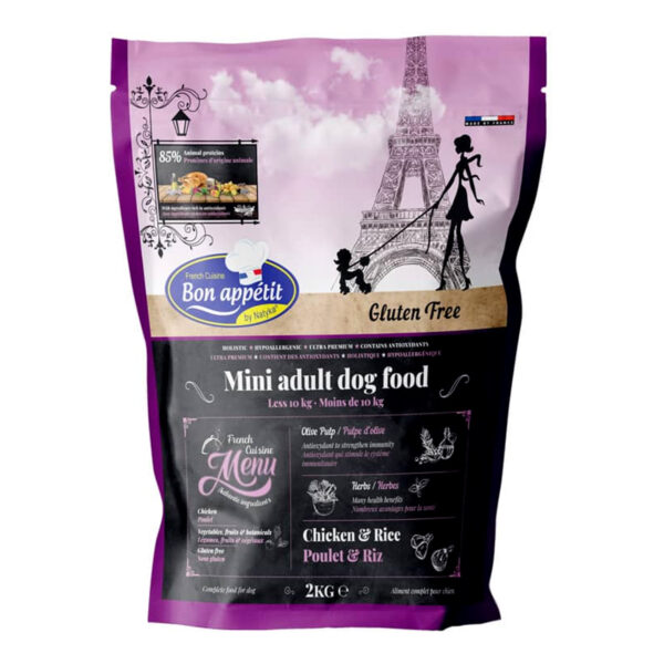 Bon Appetit Mini Chicken & Rice створений спеціально для дорослих собак малих порід, враховуючи їхні потреби у харчуванні та енергії. Основним джерелом білка є м’ясо курки, яке легко засвоюється та забезпечує організм цінними амінокислотами для підтримки м’язів і життєвого тонусу.