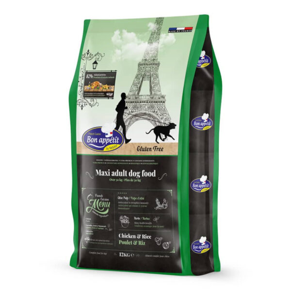 Bon Appetit Maxi Chicken & Rice спеціально створений для дорослих собак великих порід, щоб підтримувати їхню активність, силу та здоров’я. Основою рецепту є м’ясо курки та рис, які забезпечують легке засвоєння, високу поживну цінність і достатньо енергії для великих собак.